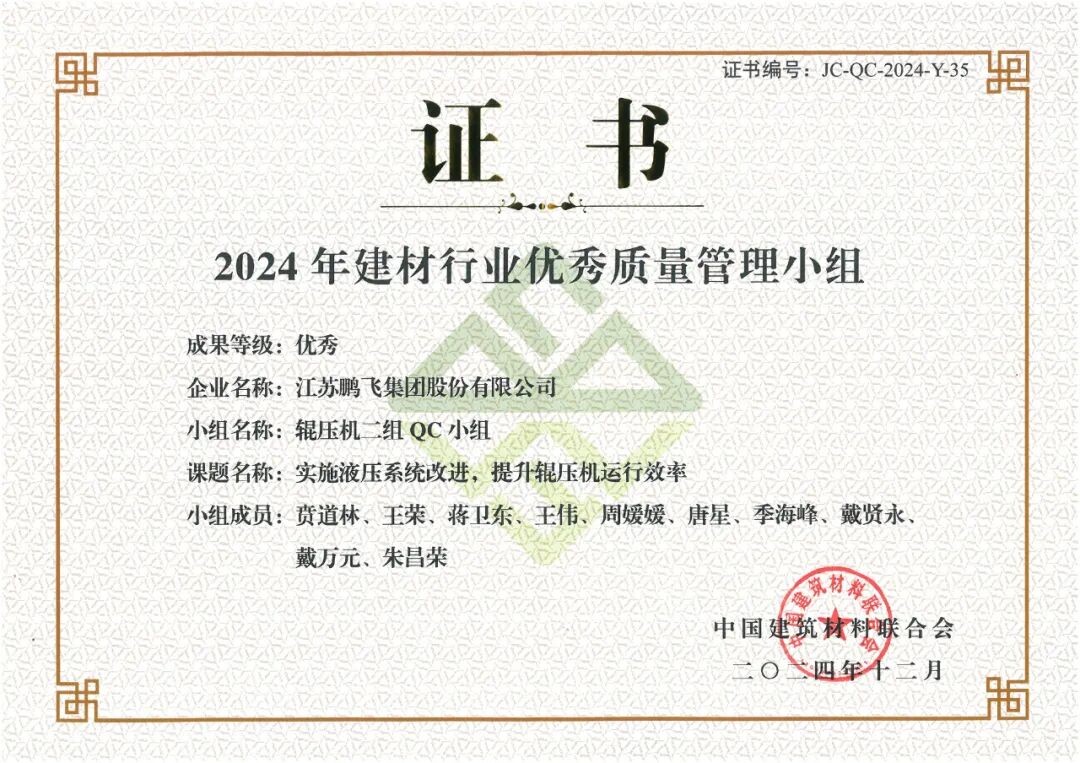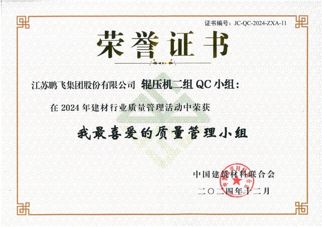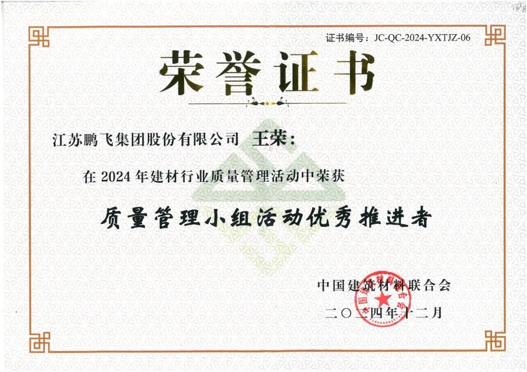 會(huì)議為2024年建材行業(yè)質(zhì)量管理活動(dòng)優(yōu)秀質(zhì)量管理成果、先進(jìn)個(gè)人和優(yōu)秀組織,2024年建材行業(yè)質(zhì)量管理活動(dòng)“我最喜愛的質(zhì)量管理小組”和“我最喜愛的質(zhì)量信得過班組”,以及2024年度建材行業(yè)“三品”典型案例的獲得者頒發(fā)證書。鵬飛多項(xiàng)成果榮獲佳績。